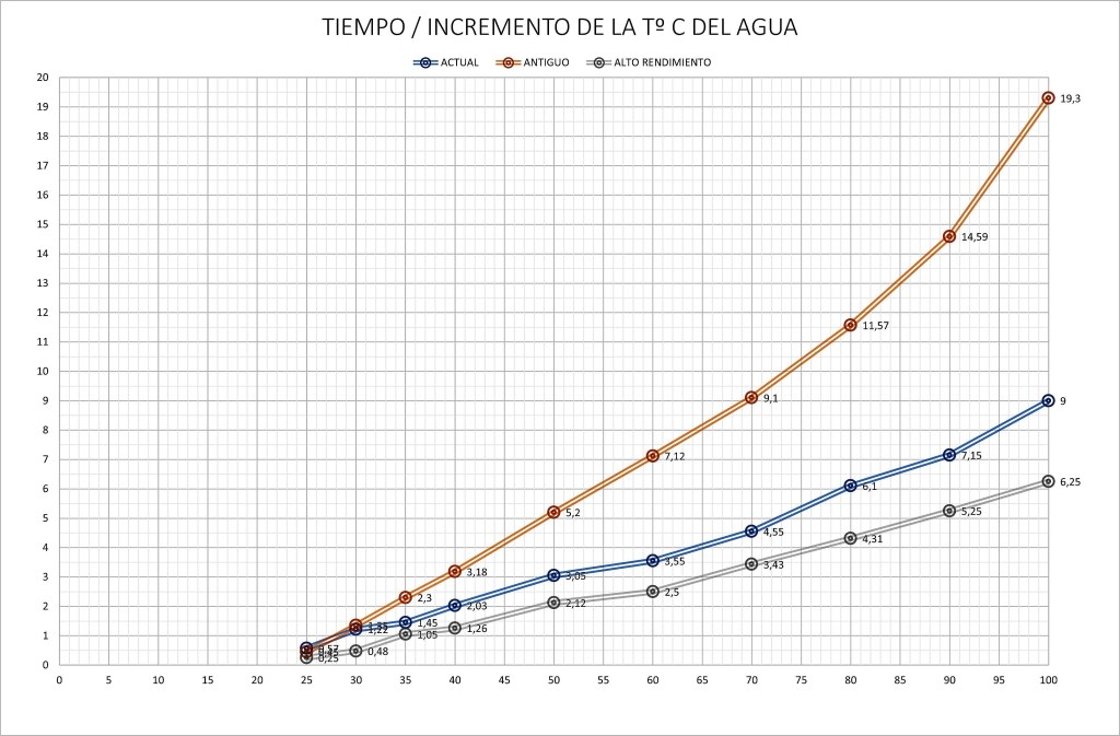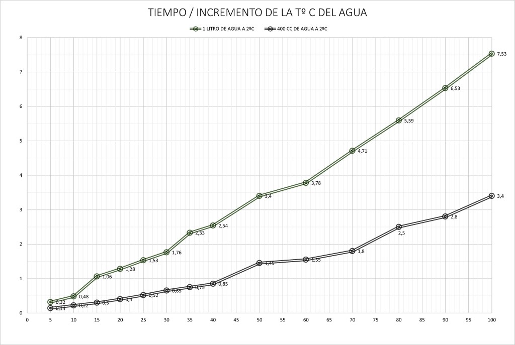 En la prueba realizada al calentar un litro de agua desde los 17ºC a los 99ºC encontramos notables diferencias en los tiempos y no así en los consumos, bastante similares.