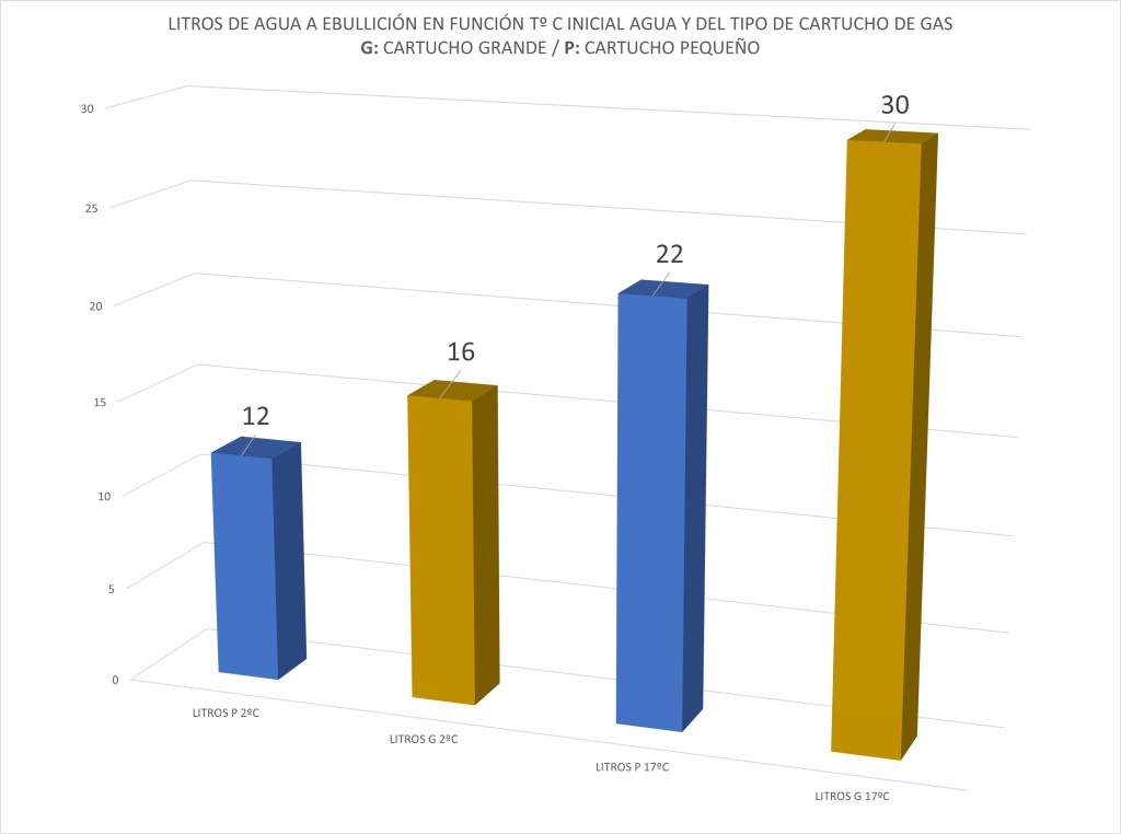 A 680 msn y una temperatura exterior entre 15ºC y 17ºC podemos calentar, hasta su ebullición, 1 litro de agua con una temperatura INICIAL entre 2ºC y 3ºC en un tiempo medio de 8 minutos con un quemador de 3500 W comercial, CONSUMIENDO un promedio de 20 gr. de gas a pleno rendimiento
