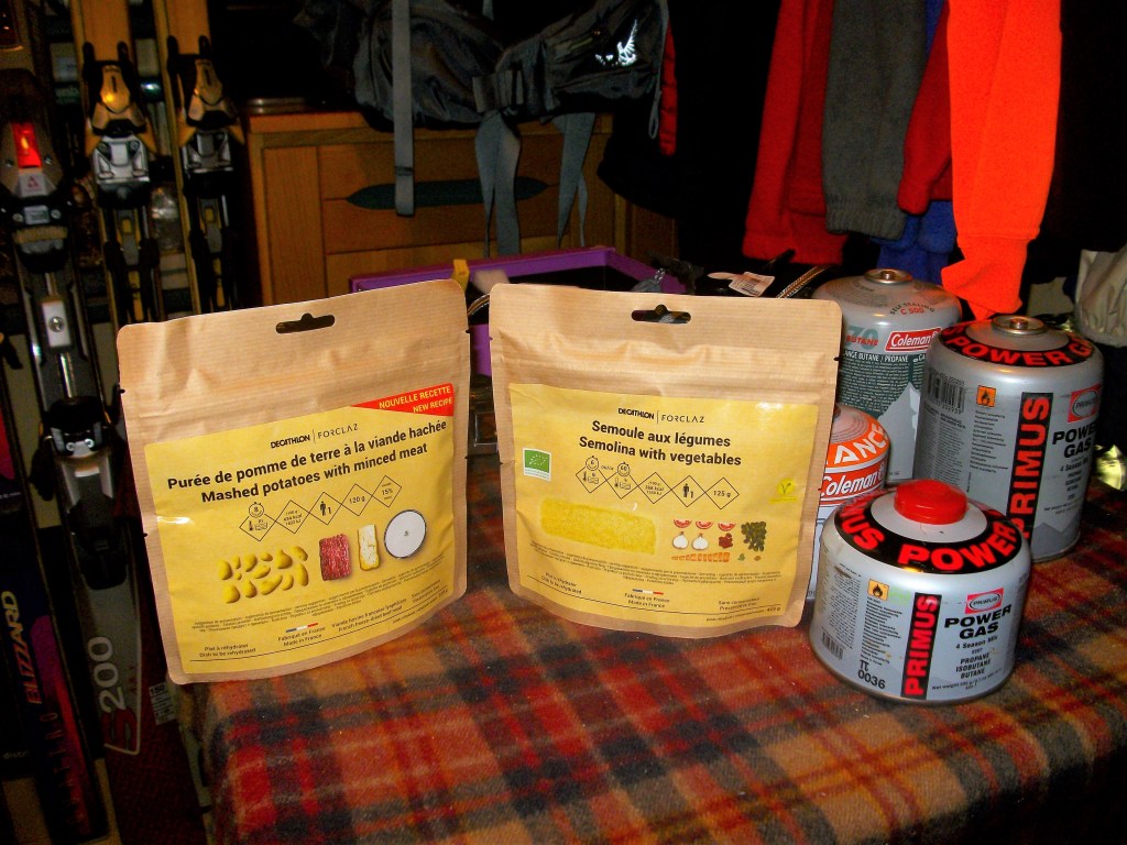 Somos partidarios de hacer una primera rehidratación con un té caliente y miel para antes de la cena y de utilizar en la cena comida LIOFILIZADA que nos ahorra una buena cantidad de peso, sopas en sobre y de postre algún albaricoque seco o similar o alguna porción de turrón, etc. al gusto. Tampoco somos partidarios de latas de conserva, por su peso y notable cantidad de desecho inorgánico-orgánico.